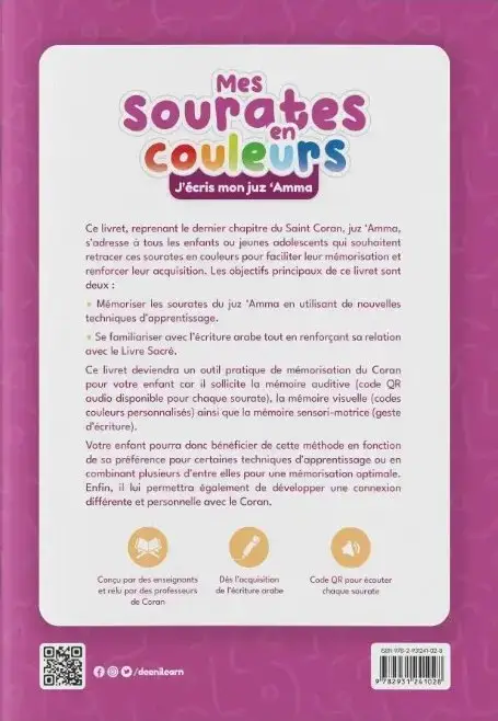 Ce livret deviendra un outil pratique de mémorisation du Coran pour votre enfant car il sollicite la mémoire auditive (code QR audio disponible pour chaque sourate), la mémoire visuelle (codes couleurs personnalisés) ainsi que la mémoire sensori-motrice (geste d’écriture).