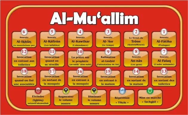 - Al-Muallim (4) Mini Tablette islamique avec sourates du Saint Coran et invocations (dou’as). Au total 18 boutons permettent d’écouter les sourates et les invocations + 4 boutons pour le réglage du volume, de répétition et de mise en marche.