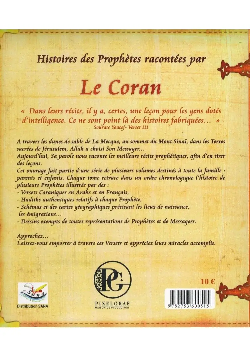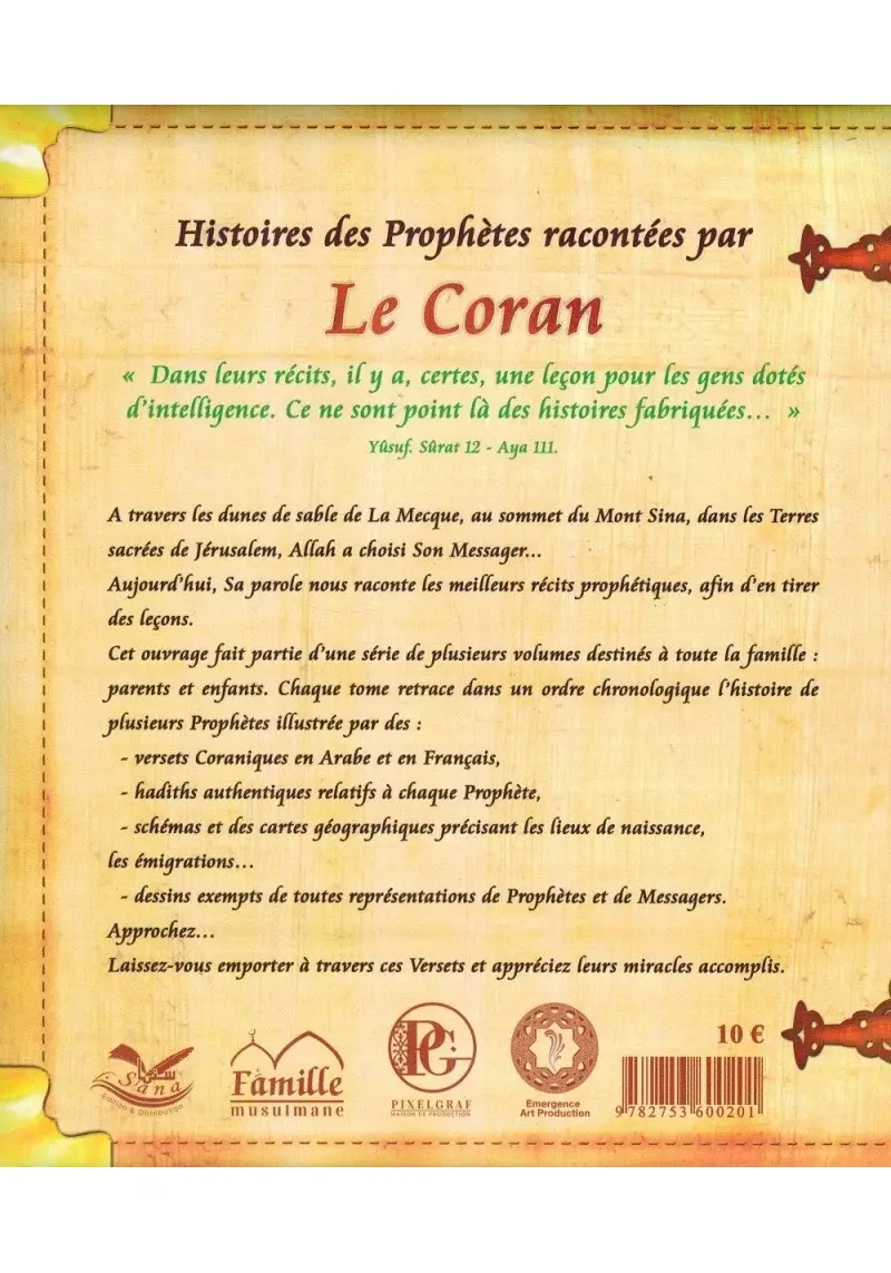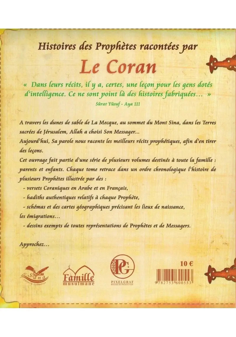 Dans leurs récits, il y a certes une leçon pour les gens doués d’intelligence. Ce n’est point là des histoires fabriquées… » Sourate Youssouf – Verset 111. A travers les dunes de sable de La Mecque, au sommet du Mont Sinaï, dans les Terres sacrées de Jérusalem, Allah a choisi Son Messager… Aujourd’hui, Sa parole nous raconte les meilleurs récits prophétiques, afin d’en tirer des leçons. Cet ouvrage fait partie d’une série de plusieurs volumes destinés à toute la famille, parents et enfants. Chaque tome retrace dans un ordre chronologique l’histoire de plusieurs Prophètes