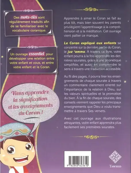 Le Coran expliqué aux enfants se concentre sur la dernière partie du Coran. « ju’ ‘Amma ». Àu travers de ce livre, votre enfant pourra à la fois apprendre les dernières sourates. grâce à une phonétique simplifiée, et aussi en comprendre le sens du fait d’une traduction accessible.
