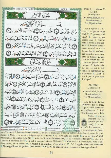 Règles de tajweed mises en valeur. Traduction française et écriture phonétique.