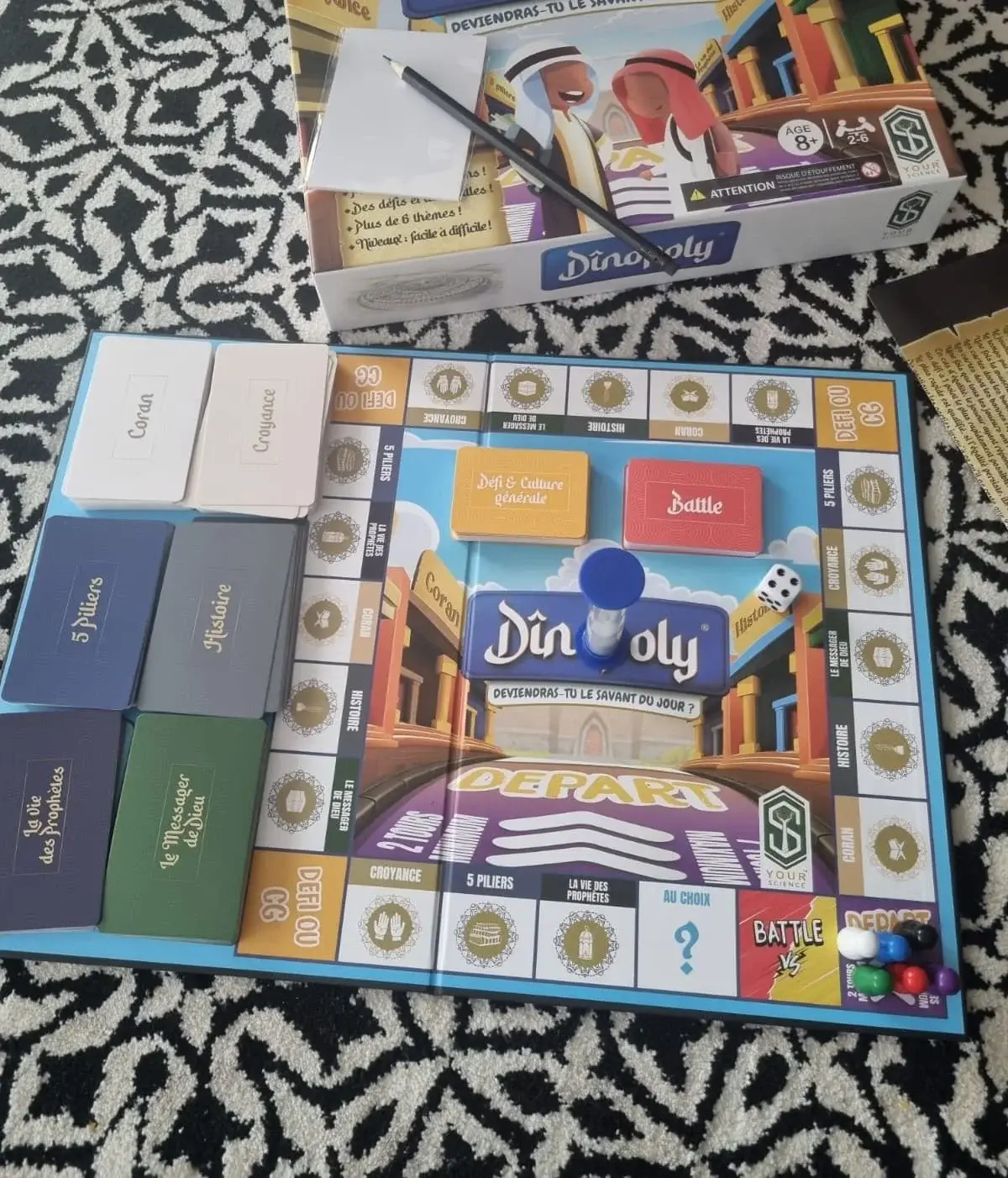 Vous cherchez un jeu amusant pour apprendre les fondamentaux de l’Islam ? Voilà DEENY QUEST, un jeu rempli de 420 questions pour tous les âges ! Avec des thèmes tels que les 5 piliers de l’Islam, la foi musulmane, le Coran, la langue arabe, le bon comportement et l’histoire des prophètes, vous vous amuserez tout en apprenant. La partie se joue en répondant aux questions et en étant le premier à atteindre l’arrivée. C’est parfait pour les enfants dès l’âge de 6 ans, et il y a trois niveaux de difficulté différents pour s’adapter à tous les âges. Avec 70 cartes pour chaque niveau, un plateau de jeu, les règles et 6 pions, vous pourrez jouer en famille ou entre amis tout en apprenant !