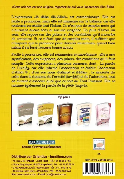 L’expression lâ ilâh illâ Allah est extraordinaire. Elle est facile à prononcer, mais elle est immense car elle renferme en réalité tout l’islam. Ce n’est pas de simples mots qui n’auraient aucun sens ni aucune exigence. Cette expression repose sur des piliers et des conditions qu’il incombe de connaitre. Si ce n’était que de simples mots, il suffirait à n’importe de les prononcer pour devenir musulman,même s’il ne ferait aucune bonne action. Facile à prononcer, elle est néanmoins extraordinaire; elle a une signification, des exigences, des piliers, des conditions qu’il faut remplir.