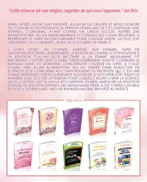 Enfin, après avoir tant patienté, Allah nous gratifie et nous honore de pouvoir vous présenter la version française de cet ouvrage tant attendu, l’original ayant connu un large succès auprès des arabophones. Et vu les enseignements et conseils qui y sont recensé, il représente LE LIVRE INCONTOURNABLE POUR CHAQUE SOEUR, qu’elle soit débutante ou confirmée, jeune fille ou mère de famille.