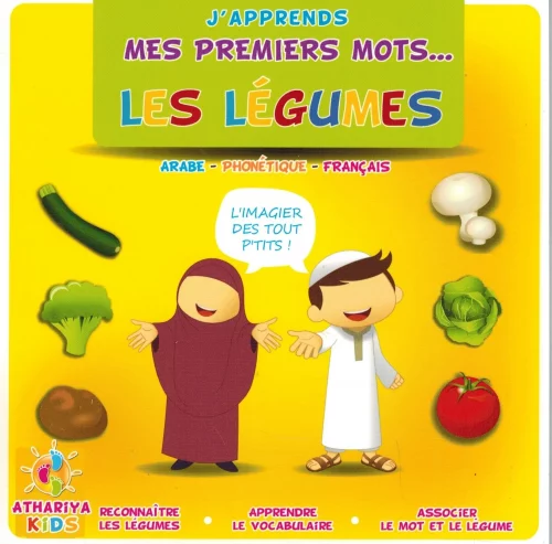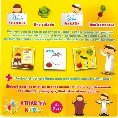 Adapté aux enfants de 2-6 ans, cet imagier est accompagné de jeux, de coloriages sans représentations figurées et de questions en fin de livre afin de les évaluer et de vous assurer qu’il ont bien retenu les mots associés aux légumes, aussi bien en arabe qu’en français !