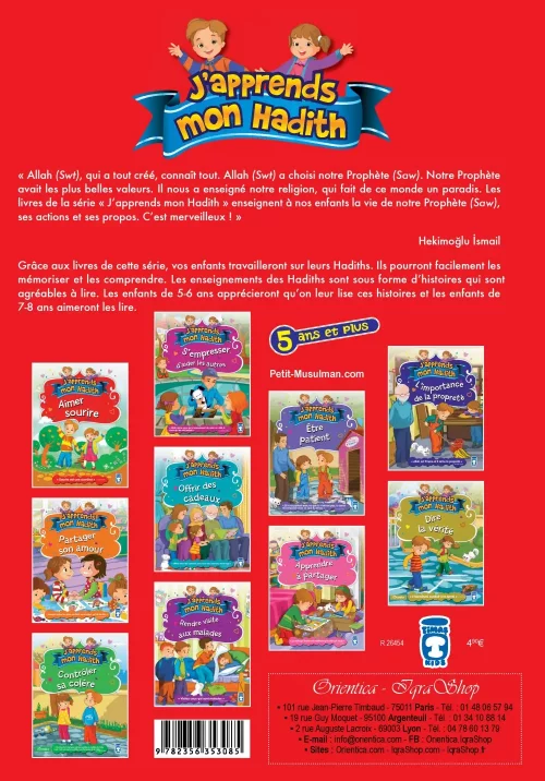 « J’apprends mon hadith » explique aux enfants comment obéir aux enseignements du prophète Mohamed (saw) dans la vie quotidienne. Les personnages principaux, un frère et une sœur, nommés Meriem et Youssef, ont une boîte à Hadith chez eux. Chaque livre de cette série concerne un Hadith particulier. Les membres de la famille essaient d’appliquer ce Hadith dans leur vie tout au long de l’histoire. Les enfants s’identifieront aux héros de l’histoire, ce qui facilitera leur apprentissage et leur pratique de tous les Hadiths.
