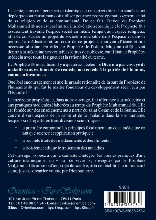 La médecine prophétique, dans notre ouvrage, fait référence à la médecine et aux pratiques médicales élaborées au temps du Prophète Muhammad (PBDSL). Elle est fondée sur des enseignements à partir du saint Coran et de la Sunna. Elle couvre divers aspects de la santé et de la maladie dans la vie humaine, lesquels sont répartis en trois divisions scientifiques :