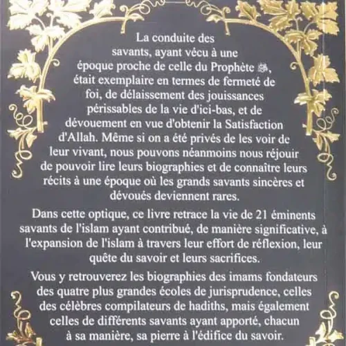 Vous y retrouverez les biographies des imams fondateurs des quatre plus grandes écoles de jurisprudence, celles des célèbres compilateurs de hadiths, mais également celles de différents savants ayant apporté, chacun à sa manière, sa pierre à l’édifice du savoir.