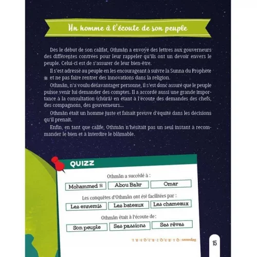 Chère maman, cher papa, n’hésitez pas à accompagner votre enfant lors de ce voyage au coeur de l’extraordinaire histoire, pleine d’enseignements, d’Omar ibn al-Khattâb. Vous-mêmes en apprendrez beaucoup !