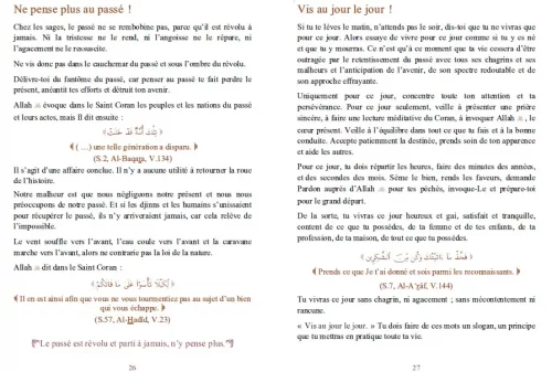 Ce livre est le futur meilleur ami de toute personne qui a connu un moment difficile ou un chagrin. Il résume la littérature musulmane traitant des nombreux maux qui affectent les individus dans notre société moderne. Des solutions aux problèmes majeurs actuels tels que l’angoisse et la tristesse, le mal-être et le désespoir, la jalousie et le pessimisme y sont présentées. Les solutions sont essentiellement puisées dans le Coran, la Parole d’Allah, le Sage, l’Omniscient, ainsi que dans la tradition prophétique, dans les mots et la vie du Prophète Muhammad (saw). Les dires sont corroborés par des versets coraniques et des hadiths, dans leur majorité, authentiques. Les récits et les témoignages de compagnons et de pieux prédécesseurs sont également cités pour nous éclairer le chemin. En bref, ce livre est une source de bonheur, de sérénité, et de quiétude, qui nous rappelle la Miséricorde d’Allah (awj), Son Indulgence, la nécessité de se remettre à Lui, de la nécessité d’avoir foi au destin, de vivre au jour le jour sans se soucier de l’avenir, et de se rappeler toujours les Grâces d’Allah (swt).