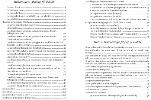 Ce premier tome regroupe quatre traités simples, destinés au débutant dans l’étude du Madhhab souhaitant par la suite étudier les traités plus approfondis jusqu’à atteindre le rang lui permettant de délivrer des avis juridiques ou d’enseigner le madhhab, ou simplement pour le musulman lambda souhaitant avoir un recueil vers lequel il pourrait revenir pour ses questions d’ordre quotidien en matière d’adoration lui permettant de connaître ce qui lui incombe.