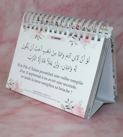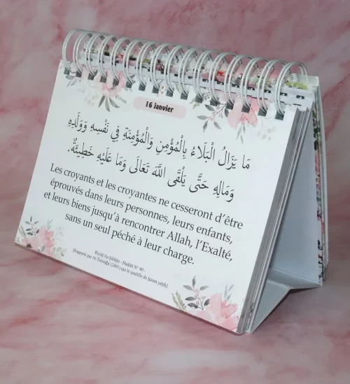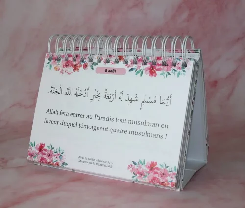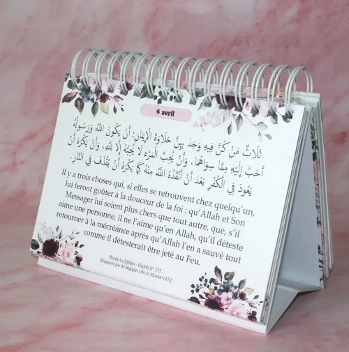 Accrochez-vous à vos chapelets, car « Un Hadith Chaque Jour » est un calendrier éducatif sensationnel! Ce petit bijou contient 365 hadiths authentiques, un par jour, soit une année pleine de spiritualité à la lumière des paroles édifiantes de Muhammad (SAW) – le meilleur des hommes. Chaque hadith est présenté en arabe et en français et est accompagné de ses sources, de ses rapporteurs et de son numéro dans les célèbres recueils de hadiths.
