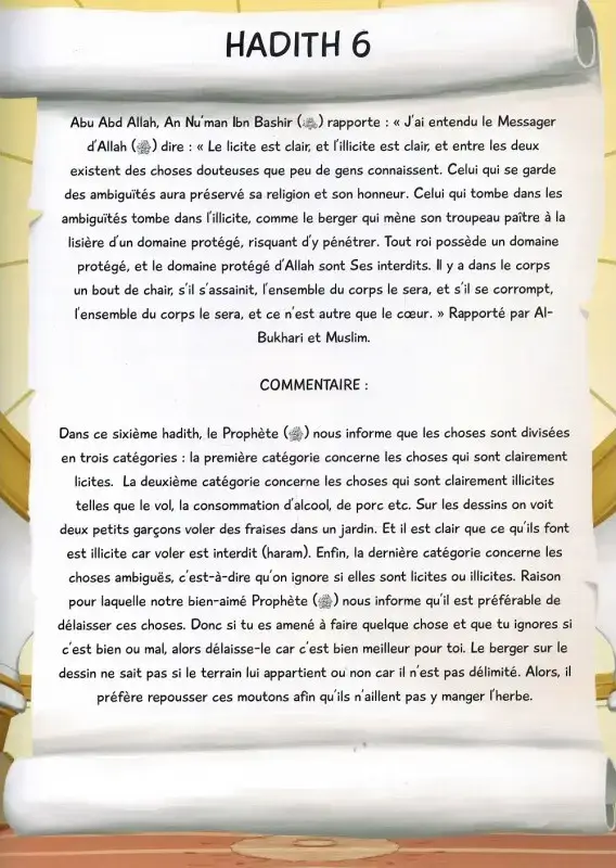 Au-delà de son aspect récréatif, ce livre se veut aussi instructif. En effet, chaque histoire est illustrée par un hadith, parole du Prophète Muhammad (Bénédiction et Salut d’Allah sur lui), qui est une source inépuisable de bons conseils. Les références – principalement choisies des livres : «Le jardin des vertueux» (Riyâd As-Sâlihîn) de l’imâm An-Nawawî et le sommaire de Sahîh Al-Bukhârî – en sont données en notes.