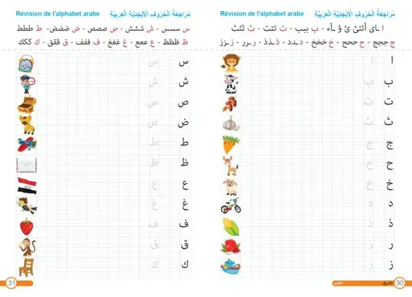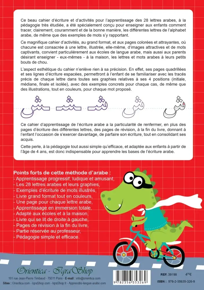 Ce magnifique cahier d’activités, au grand format, et aux pages colorées et attrayantes, où chacune est consacrée à une lettre, illustrée, elle-même, d’images attractives et de mots captivants, convient particulièrement aux écoles de langue arabe, mais aussi aux parents désirant enseigner – eux-mêmes – à la maison, les lettres et mots arabes à leurs petits bouts de chou.
