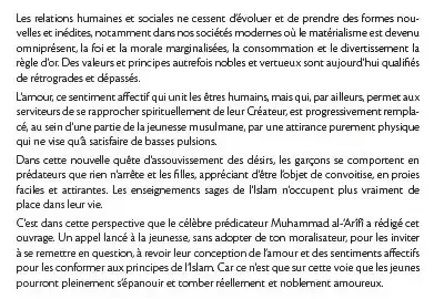 C’est pour répondre à ces préoccupations que le célèbre prédicateur Muhammad al-‘Arîfî a rédigé cet ouvrage. Il invite les jeunes à réfléchir sur leur vision de l’amour et des sentiments affectifs, et à les conformer aux principes de l’Islam. Car c’est seulement en suivant cette voie que les jeunes pourront s’épanouir pleinement et vivre un amour noble et véritable. Pas de jugement moralisateur ici, juste un appel à la réflexion!