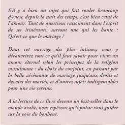 Dans cet ouvrage, l’auteur traite des obligations et des bonnes moralités qu’Allâh a ordonnées à la femme d’observer envers son époux. Ensuite, il évoque les droits de l’épouse sur son époux, ainsi que les obligations et les bonnes mœurs qu’Allâh عزَّ وجلَّ a imposées à l’époux d’observer envers son épouse. Enfin il se penche sur les droits communs aux deux époux, lesquels sont par le Législateur les résultats découlant de l’authenticité du contrat de mariage.