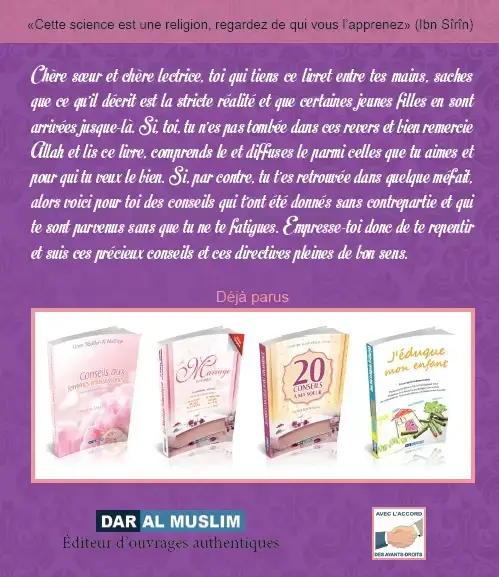 Hey toi, chère sœur et lectrice! Tiens-toi prête à découvrir une réalité qui a choqué certaines jeunes filles. Si tu n’as pas vécu ces revers, remercie Allah et lis ce livre pour mieux comprendre. Partage-le avec tes proches pour leur bien-être. Mais si tu es confrontée à des difficultés, ces précieux conseils te seront d’une grande aide. Repens-toi et suis ces directives pleines de bon sens. Ce guide est divisé en sept thèmes captivants, allant du récit de la sortie en passant par le garçon idéal jusqu’à la liste des dégâts. Méfie-toi et ne crois pas tout ce que tu entends!