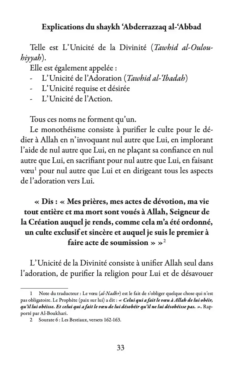 Ce livre traite donc de l’Unicité divine, qui est le principe fondamental de l’Islam, le sens même de l’attestation de foi «Il n’y a point de divinité digne d’adoration en dehors d’Allah». Ce principe consiste à vouer à Allah un culte sincère et exclusif en rejetant toute forme de polythéisme (chirk).