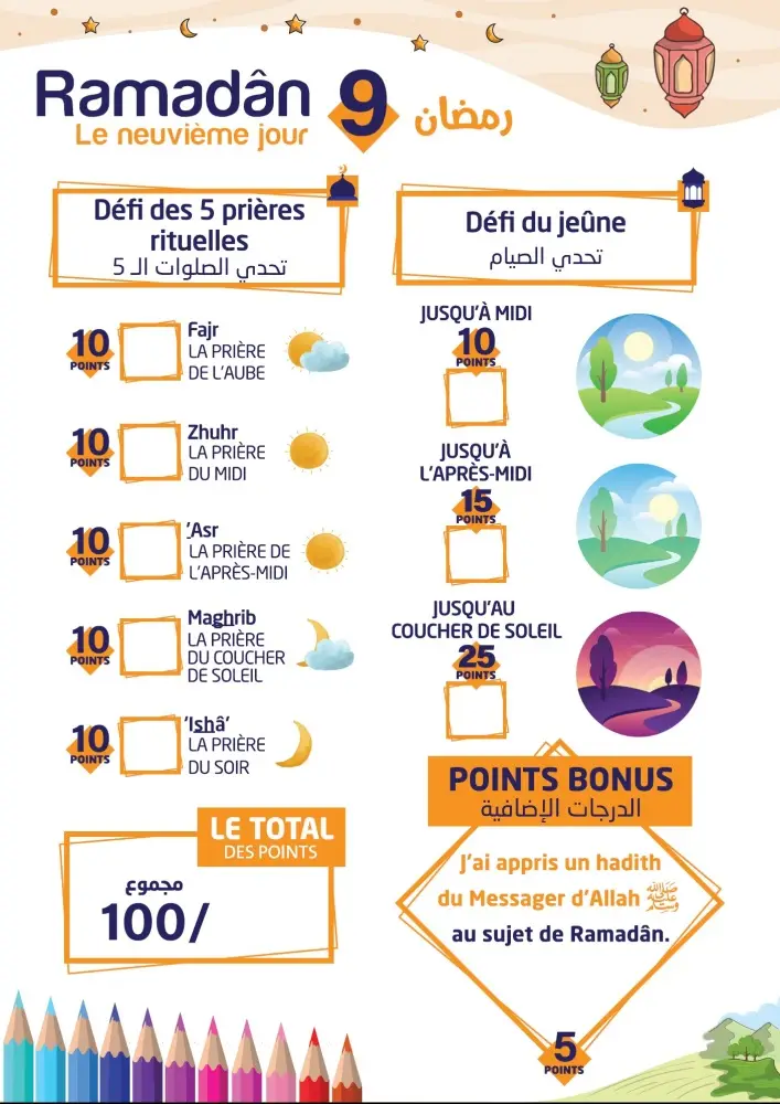 Chaque jour l’enfant va comptabiliser ses points par rapport au « défi des cinq prières quotidiennes » et au « défi du jeûne »… Par ailleurs, il apprendra chaque jour un nouveau hadith du prophète (SAW) ou une information utile sur le Ramadan et pourra réaliser un beau coloriage correspondant… Au total 30 coloriages et activités d’apprentissage pour les 30 jours de Ramadan…