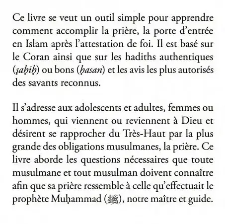 Ce livre est un outil simple pour apprendre comment accomplir la prière, la porte d’entrée en Islam après l’attestation de foi. Il est basé sur le Coran ainsi que sur les hadiths authentiques (sahih) ou bon (hasan) et les avis les plus autorisés des savants reconnus.