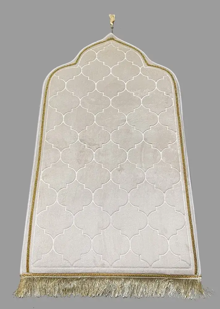 Tapis enfant très doux au toucher de type velours avec motifs discrets indiquant la direction de la qibla.