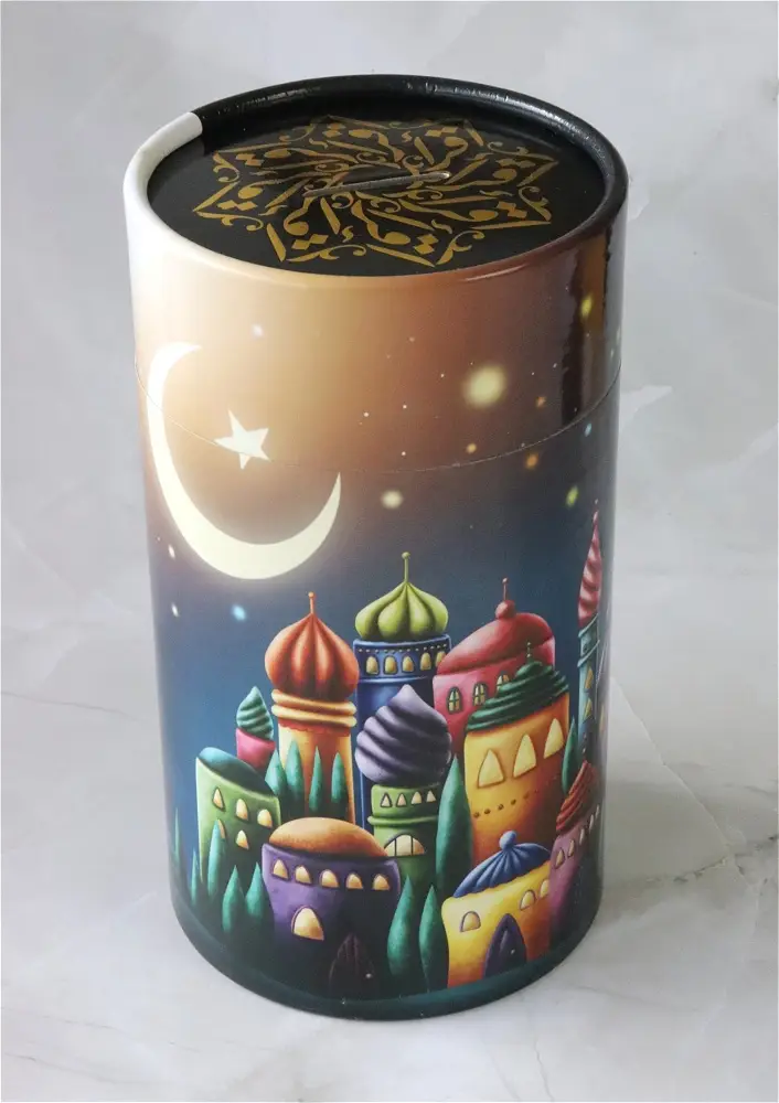Coffret tirelire avec une magnifique illustration et la calligraphie “Bismillahi Rahmâni Rahîm” en doré, au dessus dessin artistique du mot Iqra doré.